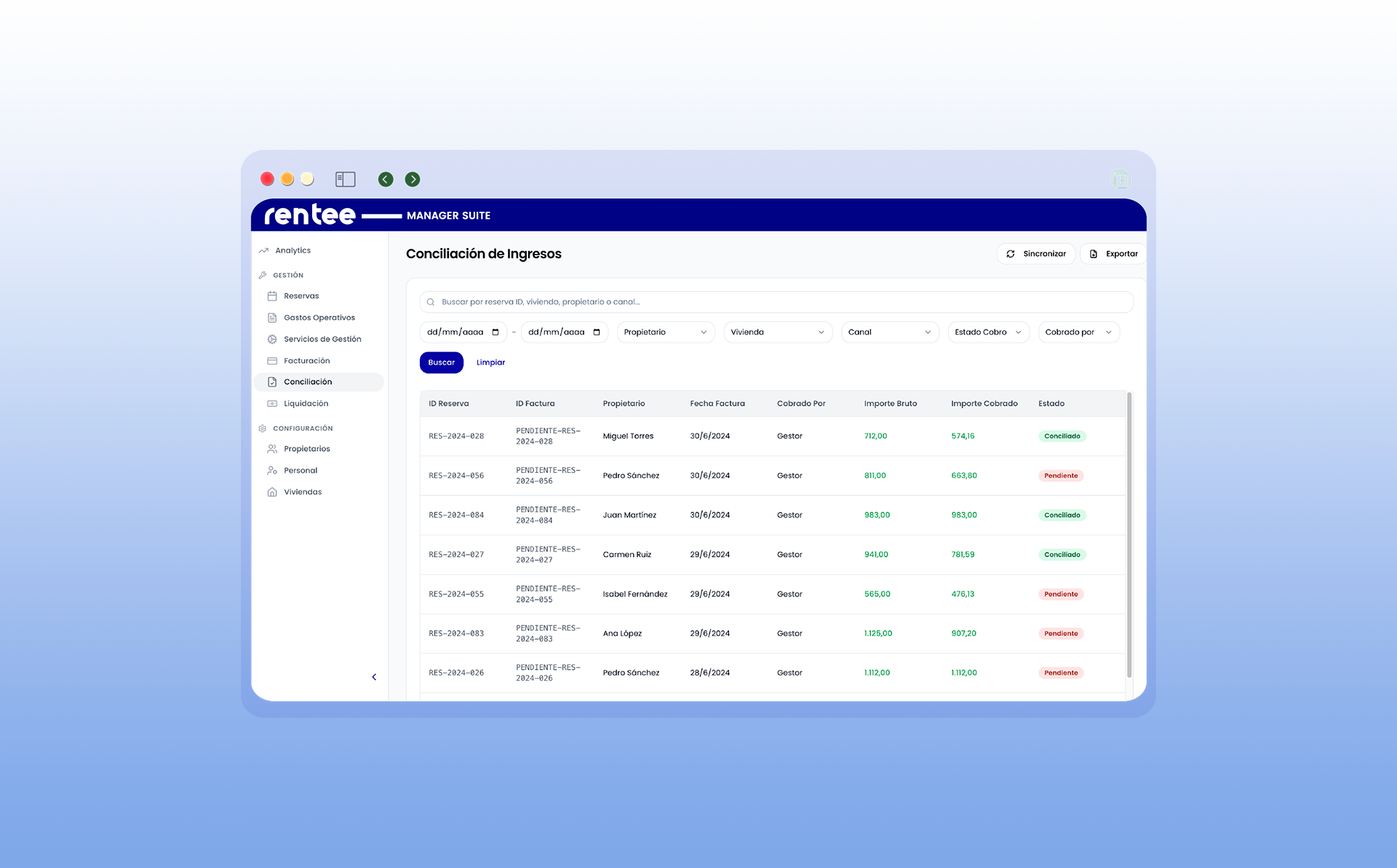 La plataforma financiera completa para gestores vacacionales: concilia, liquida y paga sin salir de Rentee.